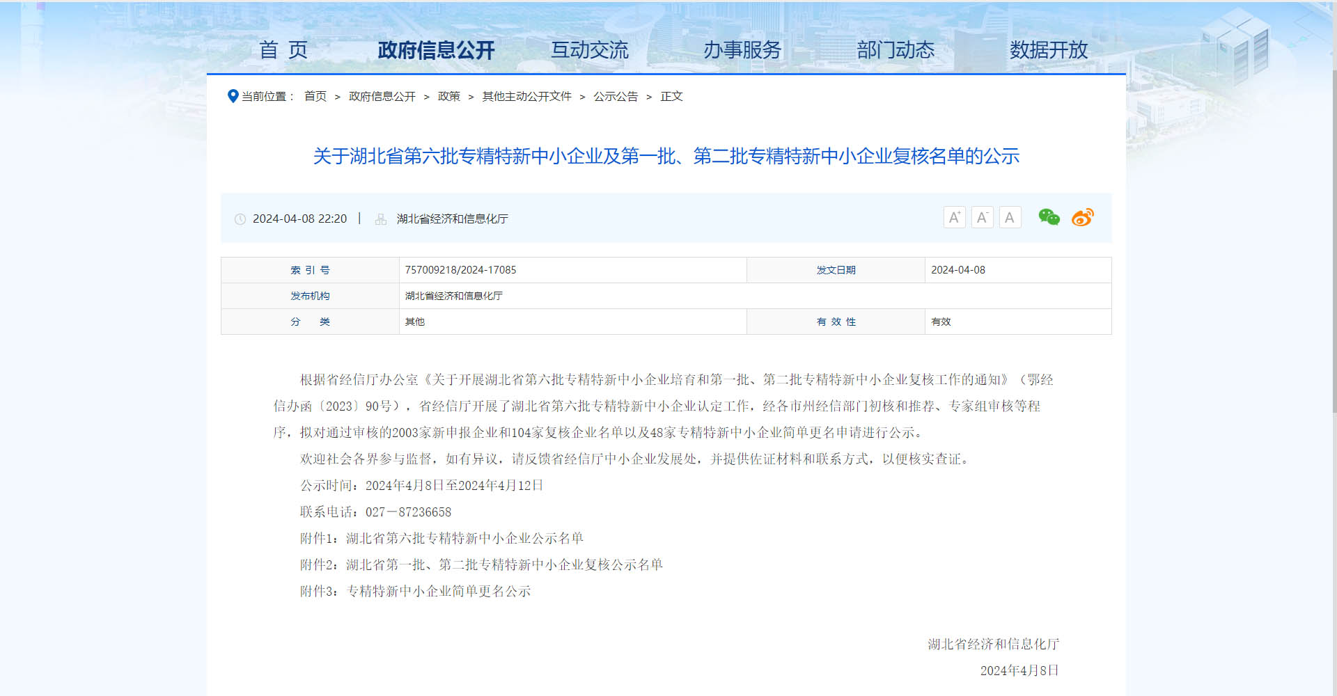 关于湖北省第六批专精特新中小企业及第一批、第二批专精特新中小企业复核名单的公示